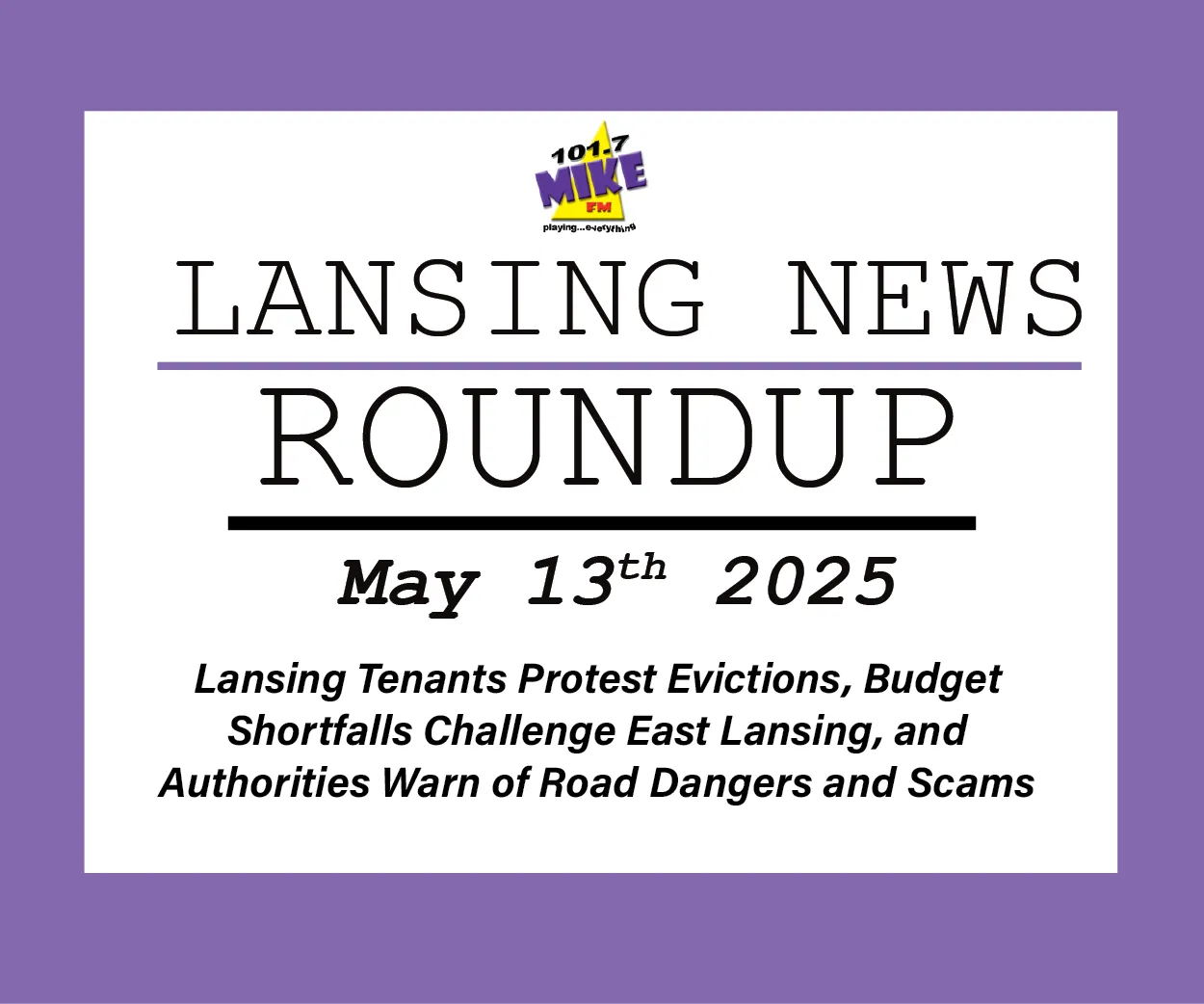 Lansing Tenants Protest Evictions, Budget Shortfalls Challenge East Lansing, and Authorities Warn of Road Dangers and Scams
