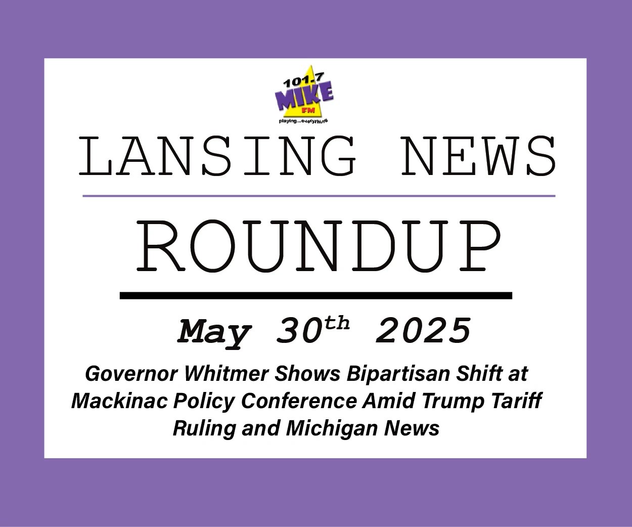 Keywords: Gretchen Whitmer bipartisan, Mackinac Policy Conference 2025, Michigan politics, Trump tariffs reinstated, Delta Township police contract, Lansing road closures, Michigan air quality advisory, wildfires in Canada Michigan