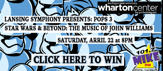 Mike's sending you to see the Lansing Symphony Orchestra's performance of "Star Wars and Beyond: The Music of John Williams" on Saturday April 22nd at Wharton Center! Sign up and you're in the running for a pair of tickets. Five winners chosen at random around 5pm on Thursday April 20th. Winners will be notified by email and phone and tickets will be available for pick up at the Mike FM Studios on Friday April 21st during normal business hours: 8am-5pm. Ticket location determined by Wharton Center and LSO. One entry per person please. All other standard Mike FM contest rules apply. Good luck!